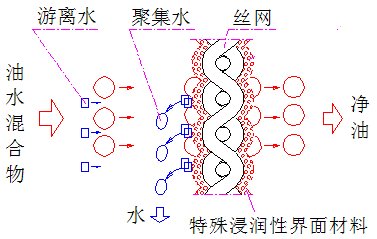 具有油水分離功能的納米界面網(wǎng)膜的分離原理圖:當非乳化的油水混合液流向經(jīng)過(guò)修飾的微納米界面結構時(shí),油體鋪展在全部親油涂層表面,油分子迅速浸潤并充分存在于表面結構的凹凸部分,宏觀(guān)上看含油的涂層表面相當于封有一層油滲透膜,該膜能使油分子相互置換并隨著(zhù)油體的滲透朝著(zhù)流動(dòng)勢能的方向運動(dòng)得以連續通過(guò)網(wǎng)膜;而油液中所含的水分在接近網(wǎng)膜的臨界面時(shí),被固體表面的超疏水納米結構所疏斥,只能被拒留在油體薄膜及疏水基團物質(zhì)的復合表面,與其它游離水聚結,靠重力場(chǎng)下油水密度差的效應匯集沉落。