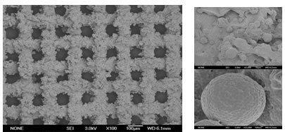 網(wǎng)膜表面的掃描電鏡照片:經(jīng)過(guò)特殊處理,在網(wǎng)膜表面形成的微米/納米結合結構幫助網(wǎng)膜形成了超親油/超疏水的表面特性。