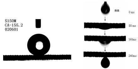 水在本功能納米界面網(wǎng)膜表面的接觸角為155±1.2°,滾動(dòng)角為3°,所以具有超強的疏水性能。油滴在本功能納米界面網(wǎng)膜表面的接觸角為0°±1.3°,因此柴油在網(wǎng)膜表面很容易鋪展及滲透,大約在240ms時(shí)即可完全透過(guò)網(wǎng)膜,所以具有超強滲透油品的能力。